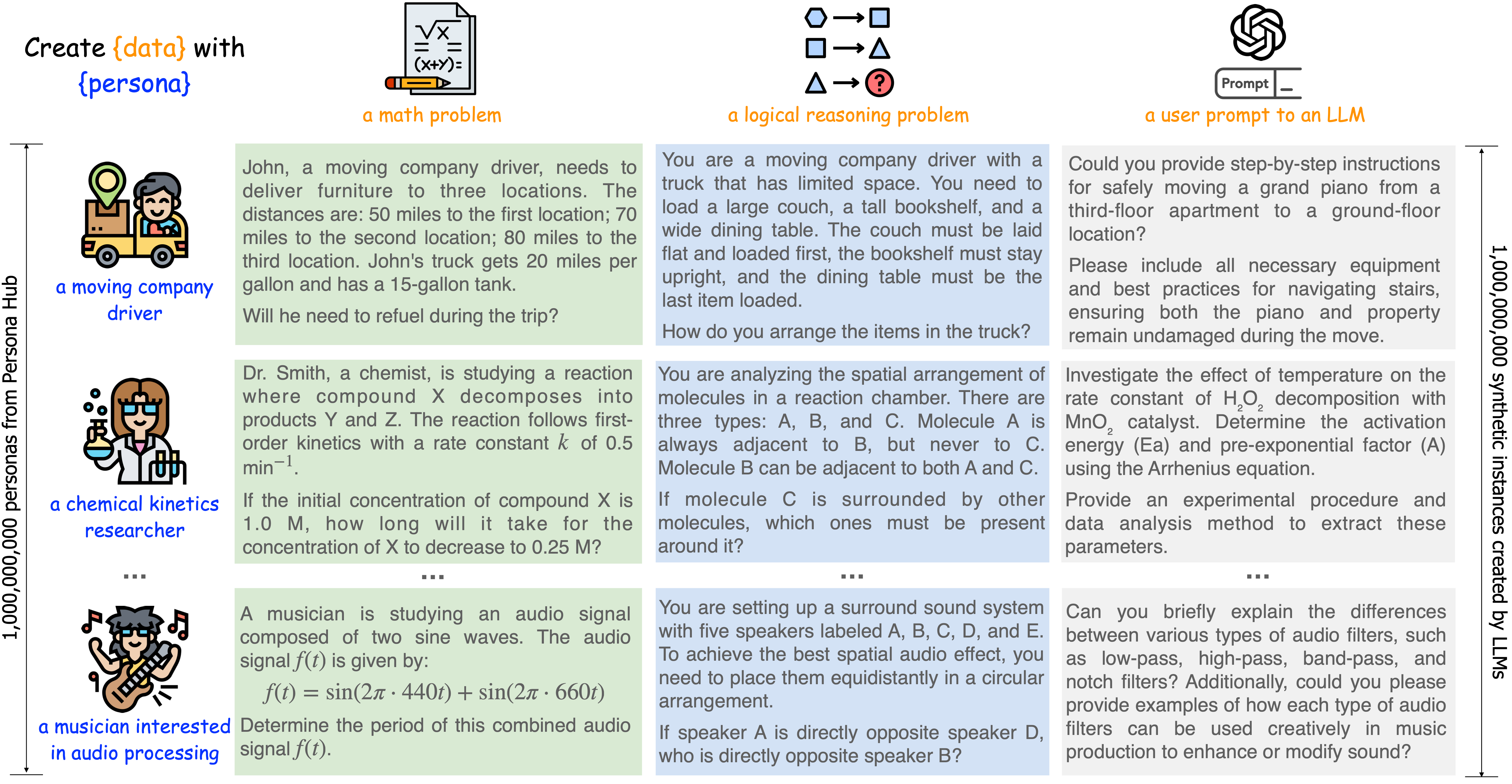 This project I really interesting from a digital twin or Anthropic’s personality concept perspective since the persona-driven data synthesis methodology can create truly diverse synthetic data. This insight was inspired by the observation that simply adding a persona to the data synthesis prompt can steer the LLM towards the corresponding perspective to create truly distinct synthetic data. The team has developed two distinct methods to create learning data 1. Text-to-Persona and 2. Persona-to-Persona.
