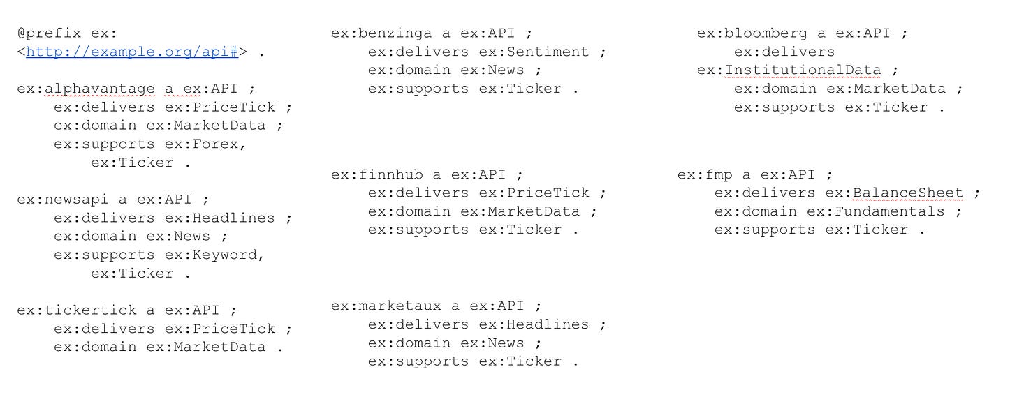 :newsapi :supports :Ticker .This might appear trivial for now, but scale it to hundreds of tools and the graph starts acting as a map of capabilities.