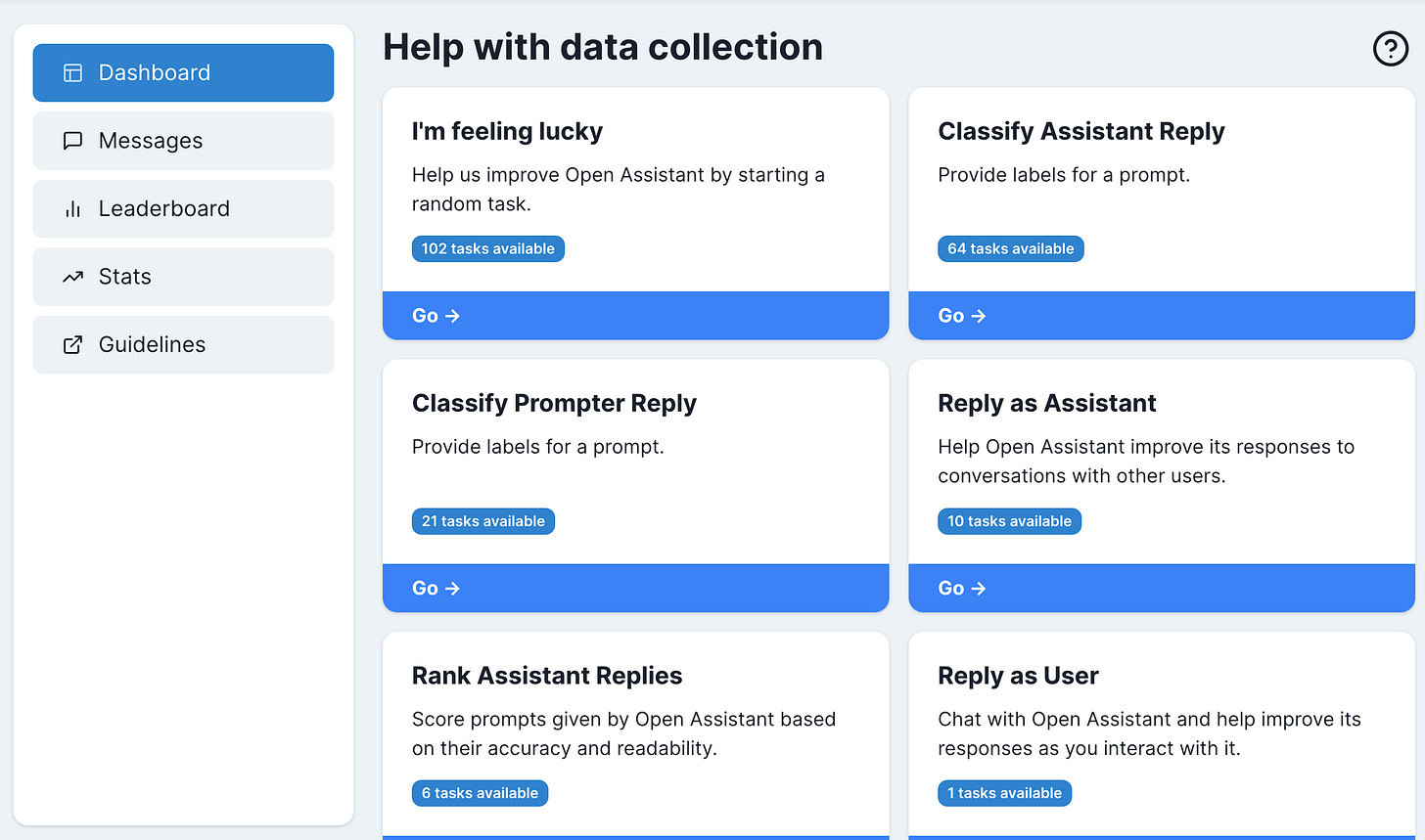 Per their own website, the project works on becoming “a chat-based and open-source assistant.” Maybe we have a different definition of assistant, but I am looking for solutions that help me build an assistant. So clearly, I am a bit confused that the main role of the website is to source human feedback.
