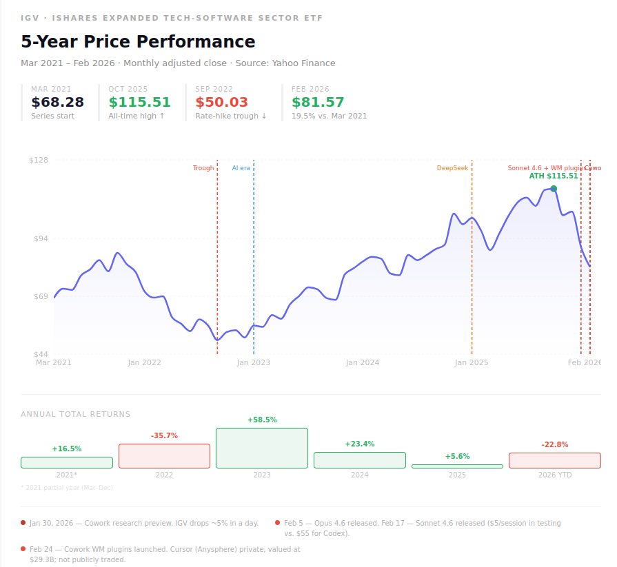 Since the launch of Sonnet 4.6, Cobol to Java, and Wealth Management as a plugin to CoWork, the stock market for many industries in general, and the software application sector in particular, has been in turmoil. Expressed as the value of the IGV ETF, this sector has lost more than 20% in valuation since the beginning of the year. Of course, that is relative to an all-time-high just a couple of days prior.