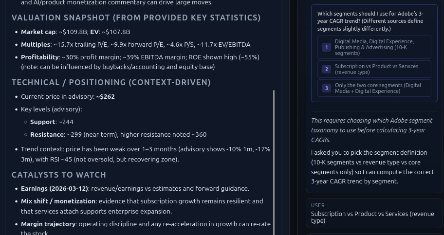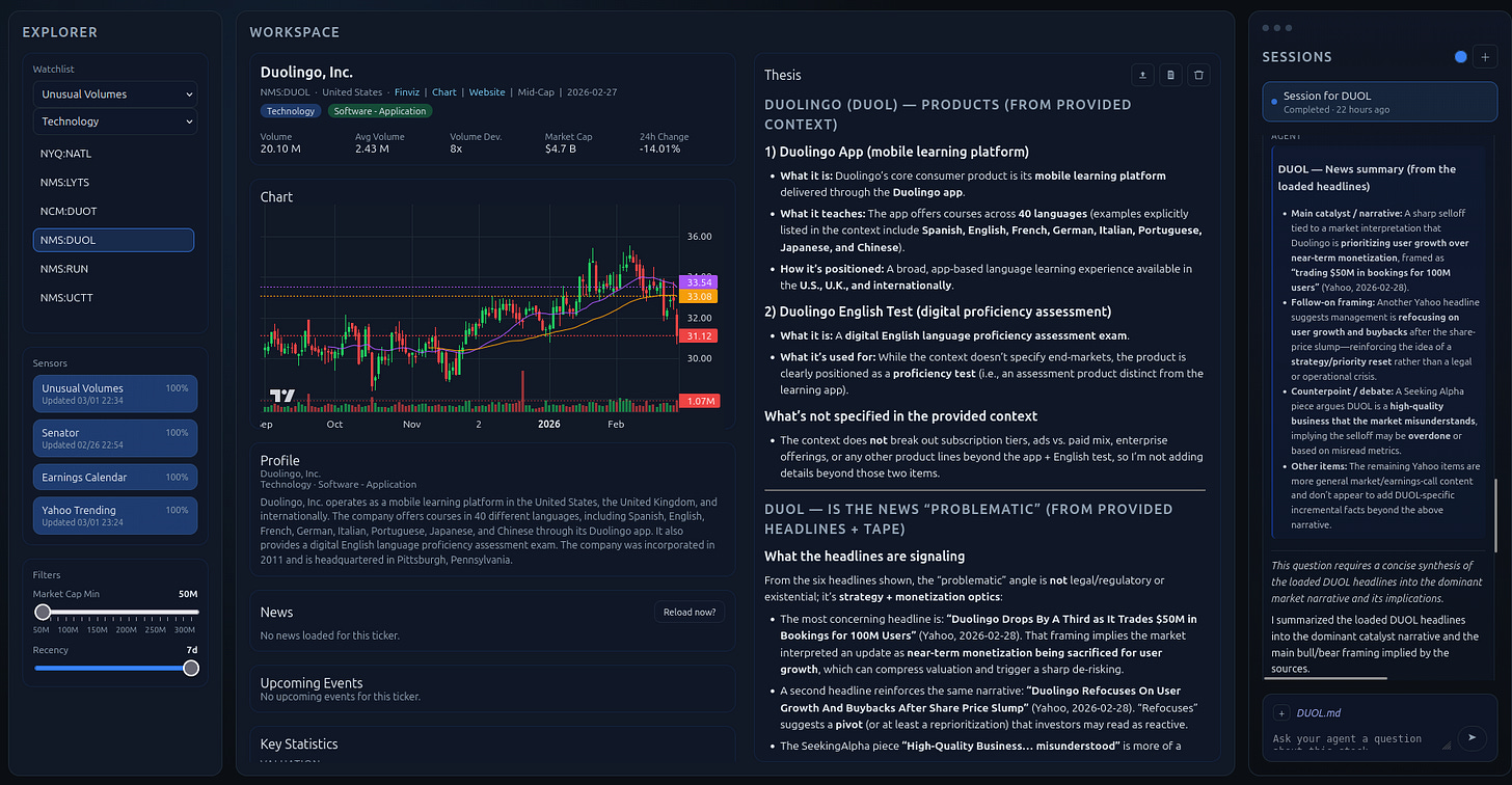 For the UI, I moved away from the limitations of Streamlit / Gradio that are fun for simple projects but don’t work well for more complex solutions. Now at the top sits a React + Vite frontend with three sections: a configuration layer, a workspace for investment data and analytical write-ups, and an agent session so I can talk to agent Superbill in real time.