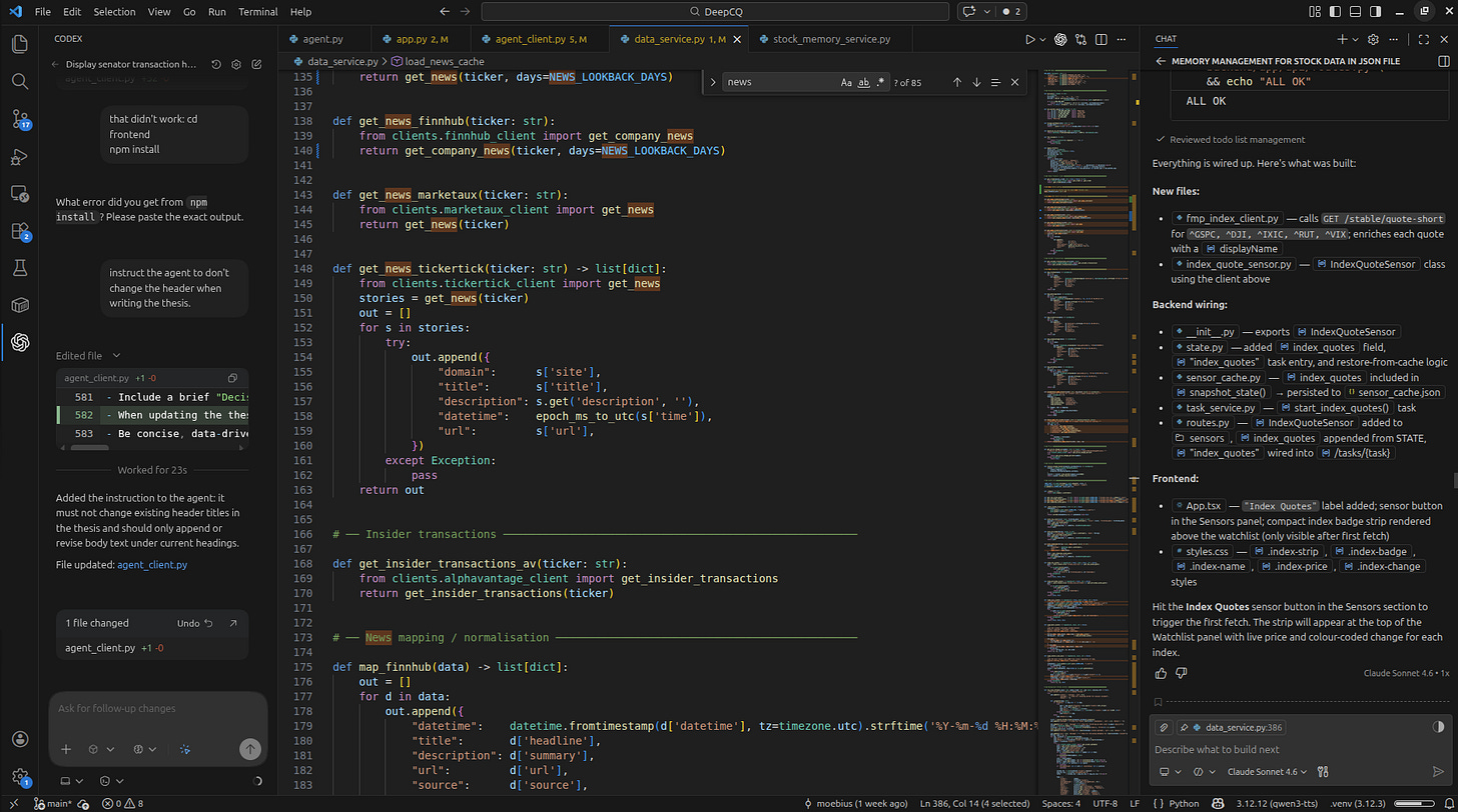 Since I had built DeepSearch for Investing in 2022/2023, I figured I would refactor the code base using Codex-5.2 and Claude Sonnet-4.6 through Copilot in VS Code.