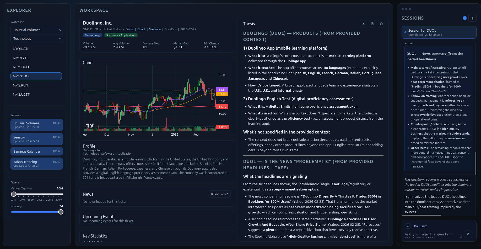 Semantic memory. captures what is known. Each tracked stock gets a {TICKER}_context, which represents a living thesis document with the current context of the stock as well as a {TICKER}.json for price and news cache. Volume scan results, sensor snapshots, and analyst notes all need to persist across sessions. When I come back after a week away, the system remembers what it thought about a name and why.