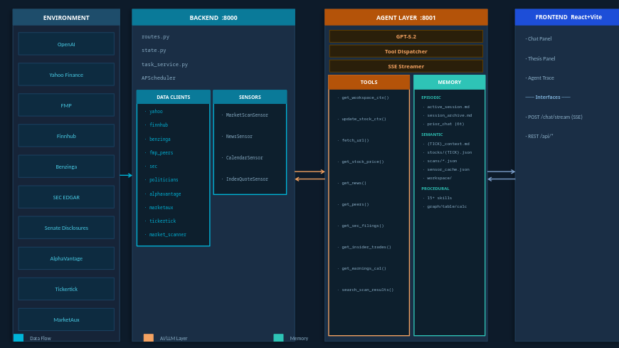 Tools are the hands of the system, mostly deterministic capabilities for external data retrieval. The agent can autonomously fetch current stock prices, pull recent news, retrieve SEC filings, check insider trades, search earnings calendars, scan for volume anomalies, and fetch arbitrary URLs when needed.