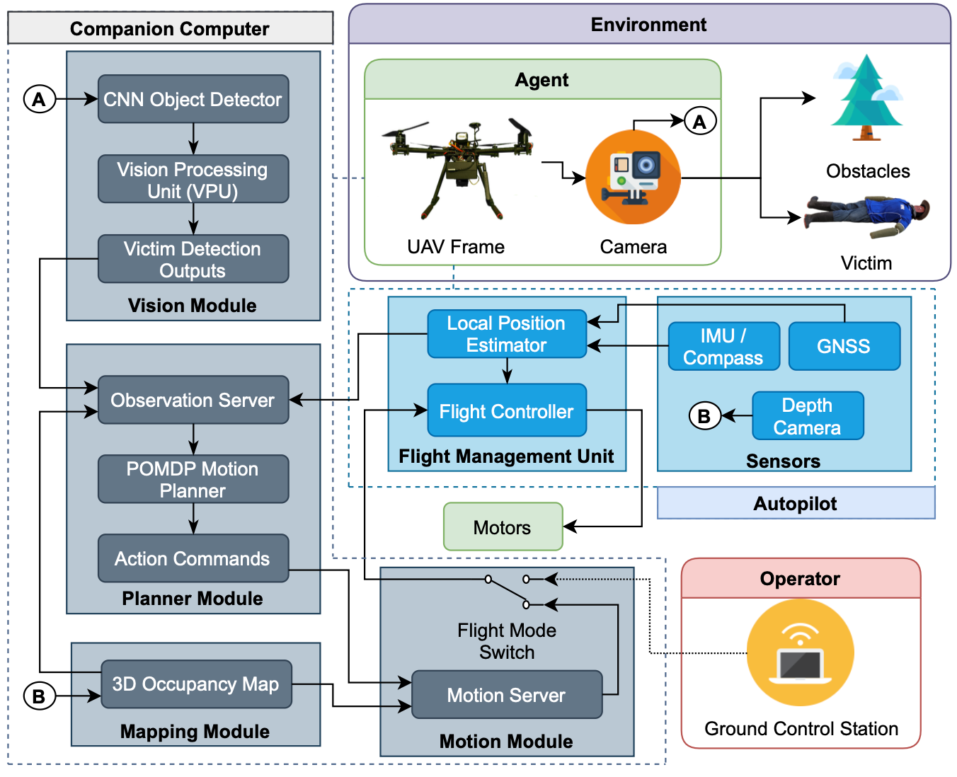 Proposed Solution: The project team combines a standard Holybro X500 UAV with a GoPro and an “AI brain” to improve search path planning and object detection. This “brain” consists of a vision module that runs a convolutional neural network object detector with the help of a Vision Processing Unit. A planner module that employs a Partially observable Markov decision process to instruct the motion server with action commands. And a mapping module that defines trajectories over a 3D occupancy map.